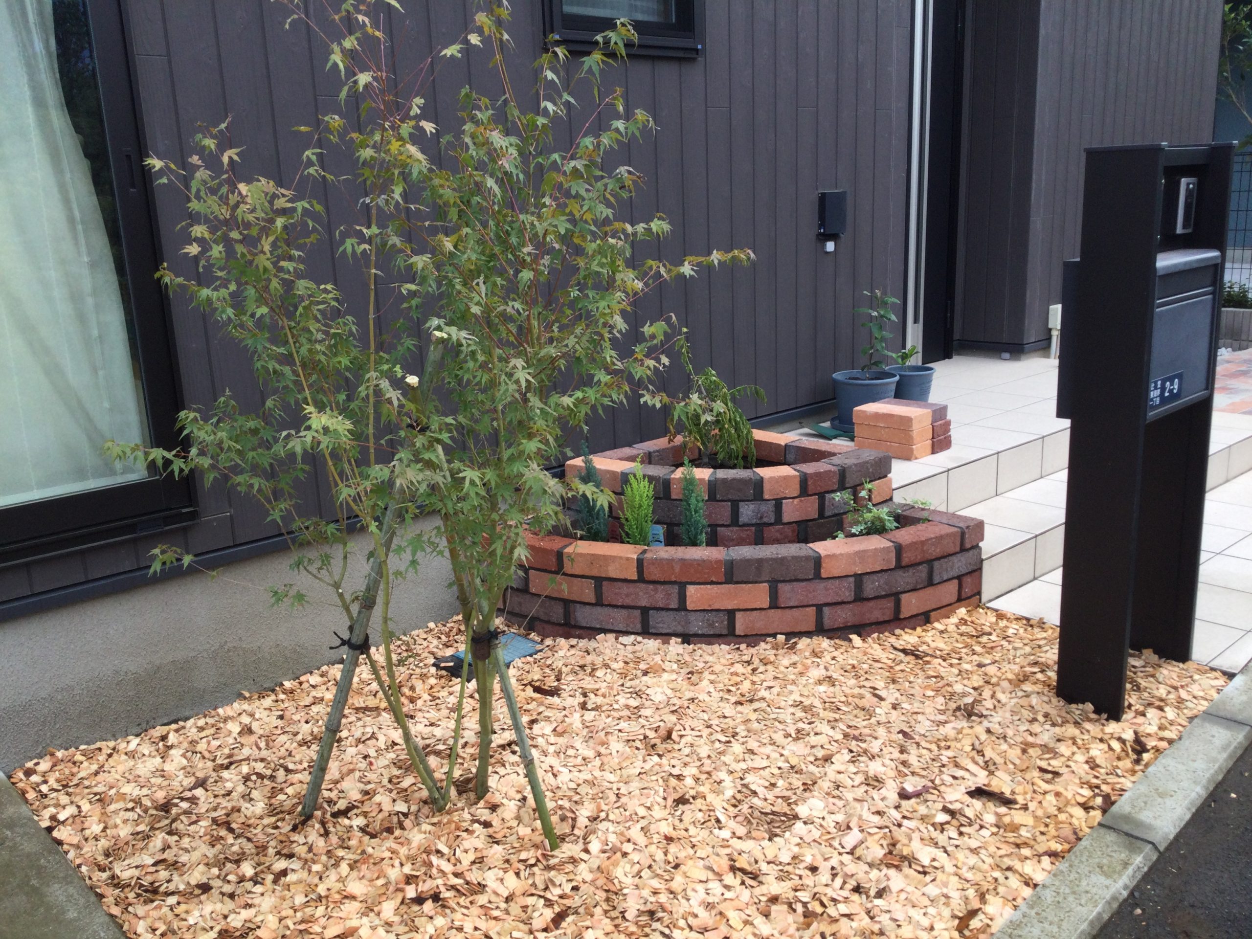 完了 レンガ花壇、ヒノキチップ+防草シート