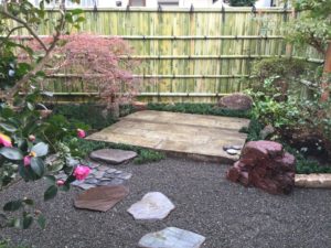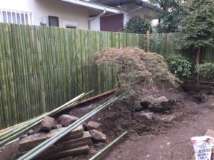 庭の背景から作ります。ここでは、現代住宅にも合い、施主様も好きな建仁寺垣